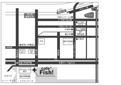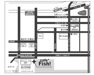 cafe*Fish! 神戸市中央区波止場町2-8 TEL078-334-1820 JR元町駅・阪神電鉄西元町駅より南へ徒歩約7分 *お車でお越しの方は周辺の有料駐車場をご利用ください。 |