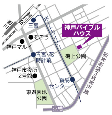 神戸バイブルハウス チャペル 神戸市中央区磯上通4丁目1-12 ハイパーホテル1・2・3 2階 TEL078-252-1966 *南側階段をご利用ください。 各線三ノ宮駅より南へ徒歩約7分 *お車でお越しの方は周辺の有料駐車場をご利用ください。 ![]() |
