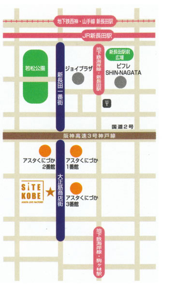 SITE KOBE 神戸市長田区久保町6丁目1番 アスタくにづか4番館4F TEL.078-612-3340 JR・地下鉄新長田駅より徒歩6分 *お車でご来場の方は、 アスタくにづか有料駐車場をご利用ください。 |