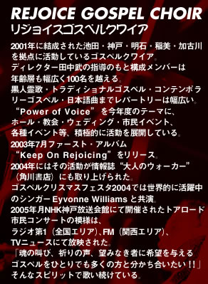 田中聖 幼少の頃より、恵まれた音楽環境の中、ゴスペルミュージックに慣れ親しみ、 2001年リジョイスゴスペルクワイア発足時より、 タンバリン&パーカッションを担当する。 タイトなビートでアンサンブルにアクセントを添える。 現在小学6年生。 |